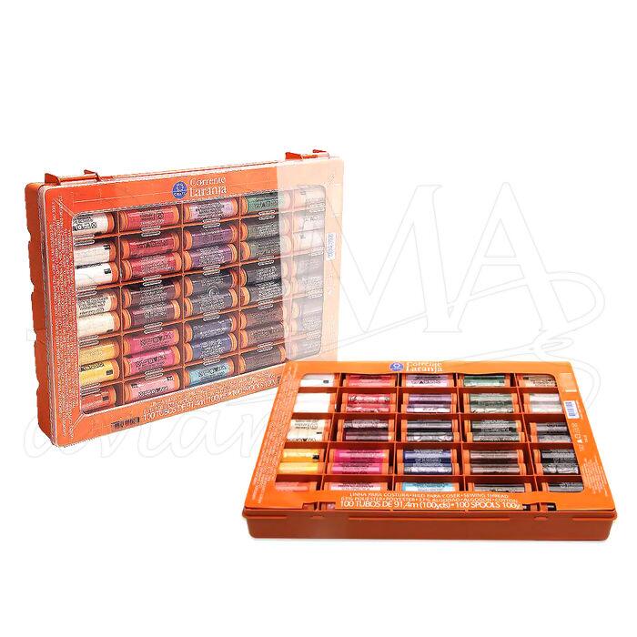 O nosso Sortimento Corrente Laranja, possui 100 tubos com 23 cores sortidas. A linha Corrente Laranja é uma linha destinada a costura de tecidos leves e médios de composição mista, sintética ou natural. Possui maior resistência, mais fina e proporciona acabamento perfeito com cores firmes e toque de algodão.