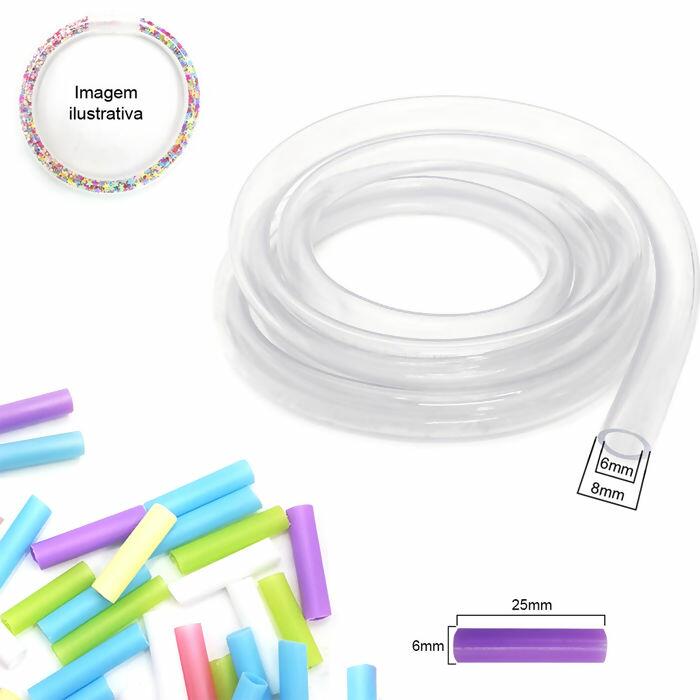 Kit ideal para fazer pulseira piscina, possui todos os materiais necessários como 10 tubos de 8mm x 20cm, 10 fechos de 6mm para lacrar a pulseira.