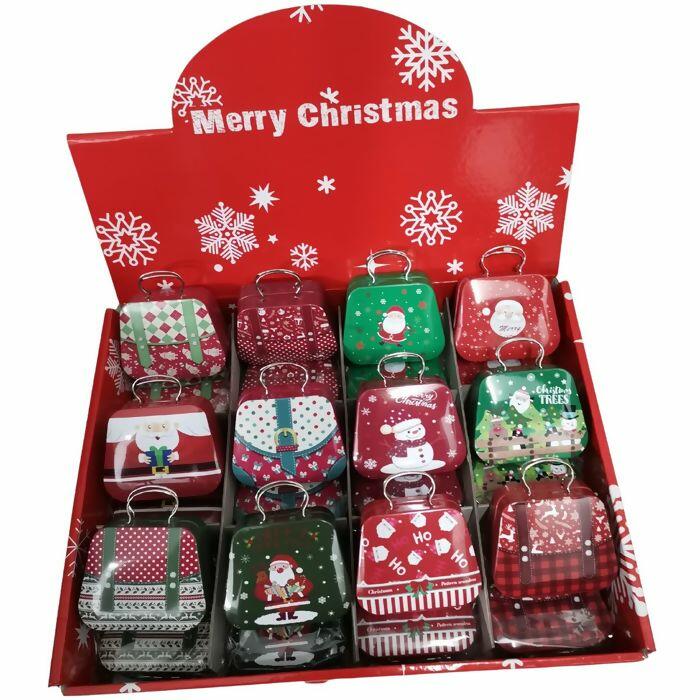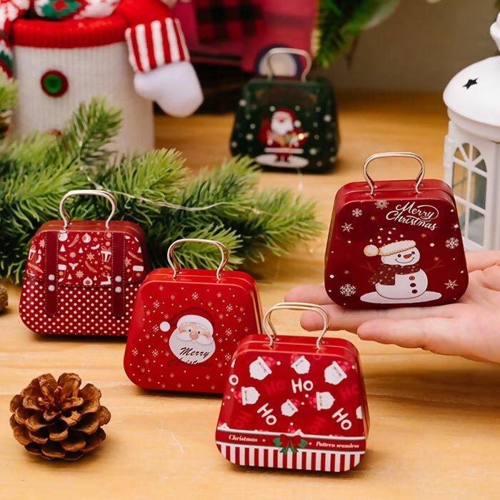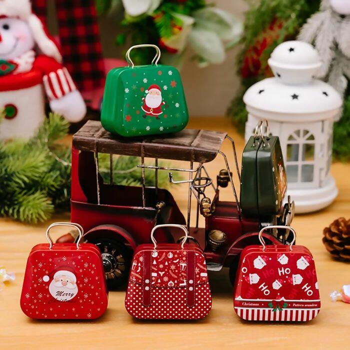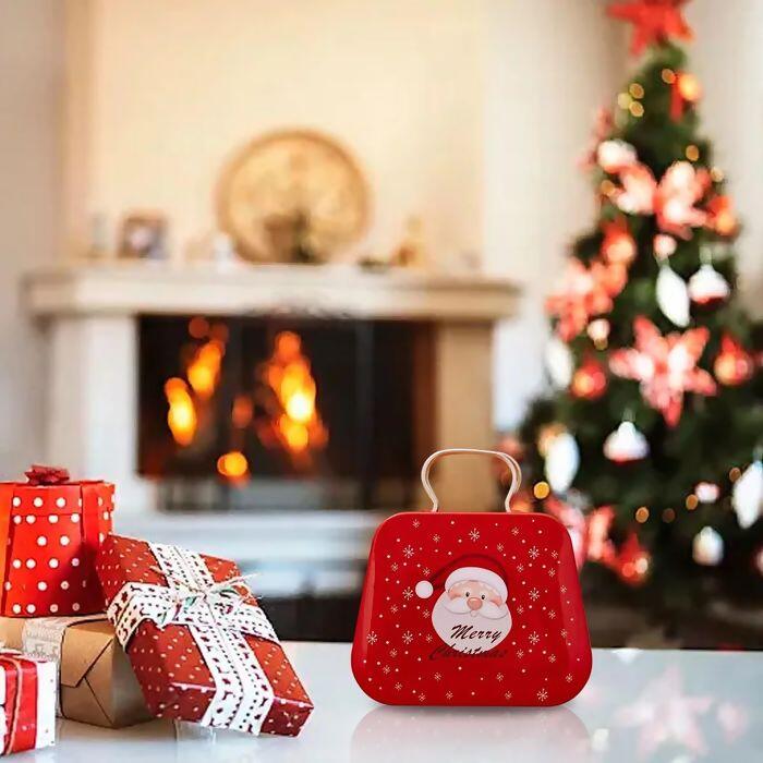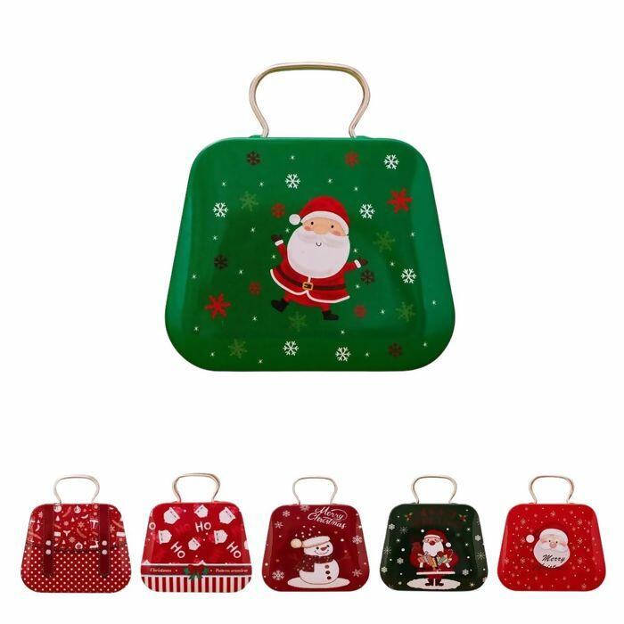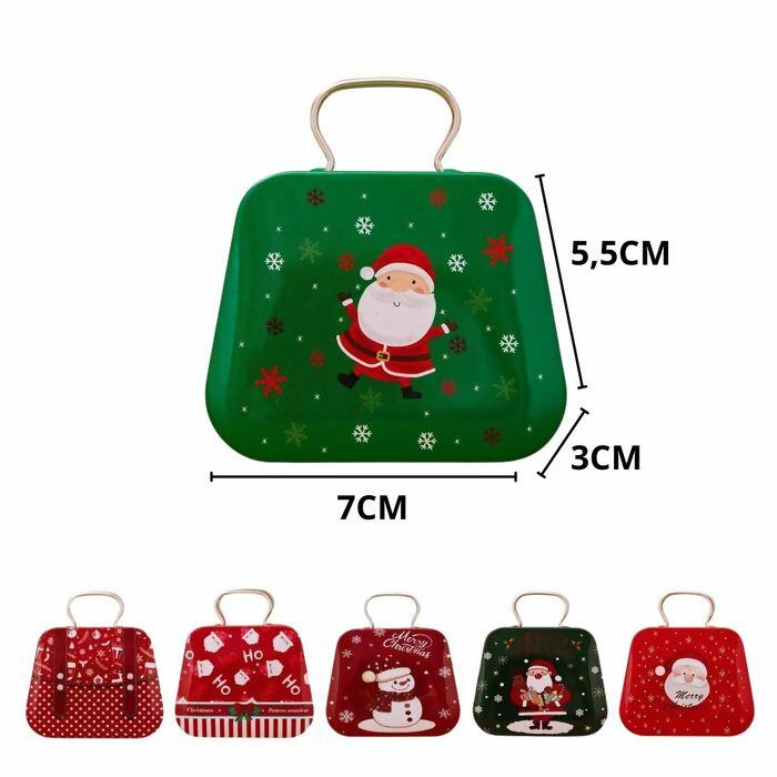 As latas de Natal decorativas são perfeitas para trazer ainda mais charme às festas de fim de ano. Produzidas em metal resistente, possuem design em formato de bolsa, alça metálica e estampas natalinas variadas como Papai Noel, boneco de neve, árvores e padrões festivos.