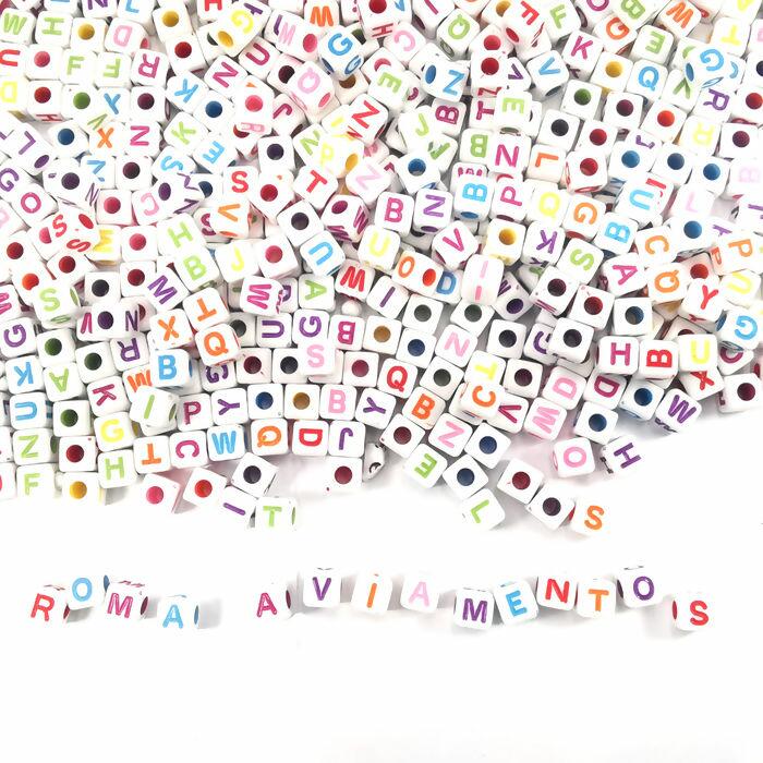 Miçanga cubo com letrinhas estampadas para confecção de bijuterias como colares, pulseiras, bolsas, braceletes, chaveiros e outros diversos tipos de decorações.