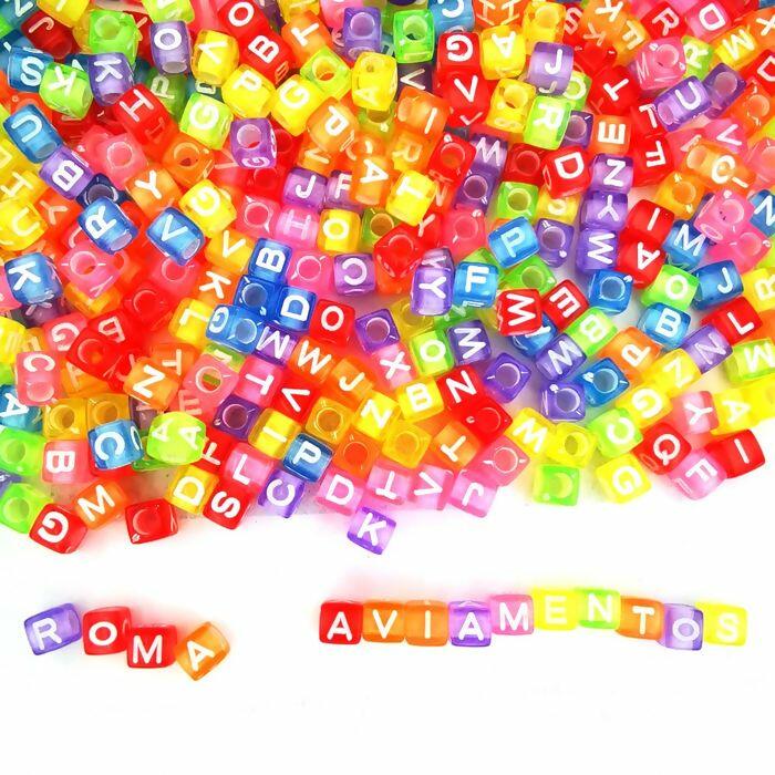 Descrição Miçanga Cubo com Letrinhas - pacote com 500g - 6mm - Multicor - RO.150755