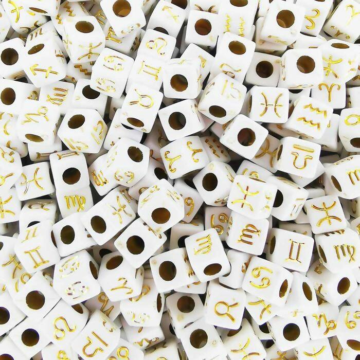 Miçanga cubo com simbolos do zodíaco (signo) estampadas para confecção de bijuterias como colares, pulseiras, bolsas, braceletes, chaveiros e outros diversos tipos de decorações.