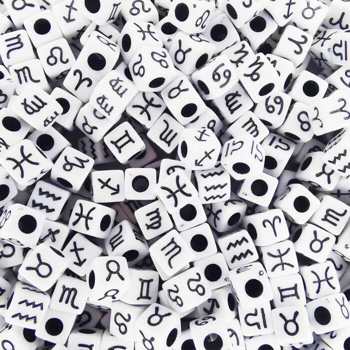 Miçanga cubo com simbolos do zodíaco (signo) estampadas para confecção de bijuterias como colares, pulseiras, bolsas, braceletes, chaveiros e outros diversos tipos de decorações.
