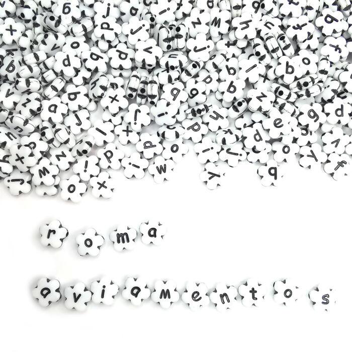 Descrição Miçanga Flor com Letrinhas - Com furo - 10mm - pacote com 500g - Preto / Branco - 054769