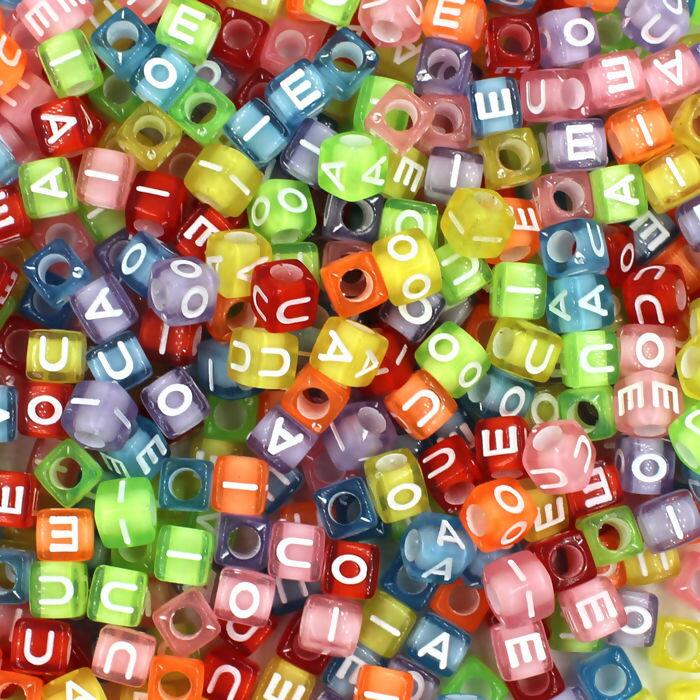 Descrição Miçanga Quadrada - Letras Vogais - 250 gramas - 6mm x 6mm - ROFR.150755