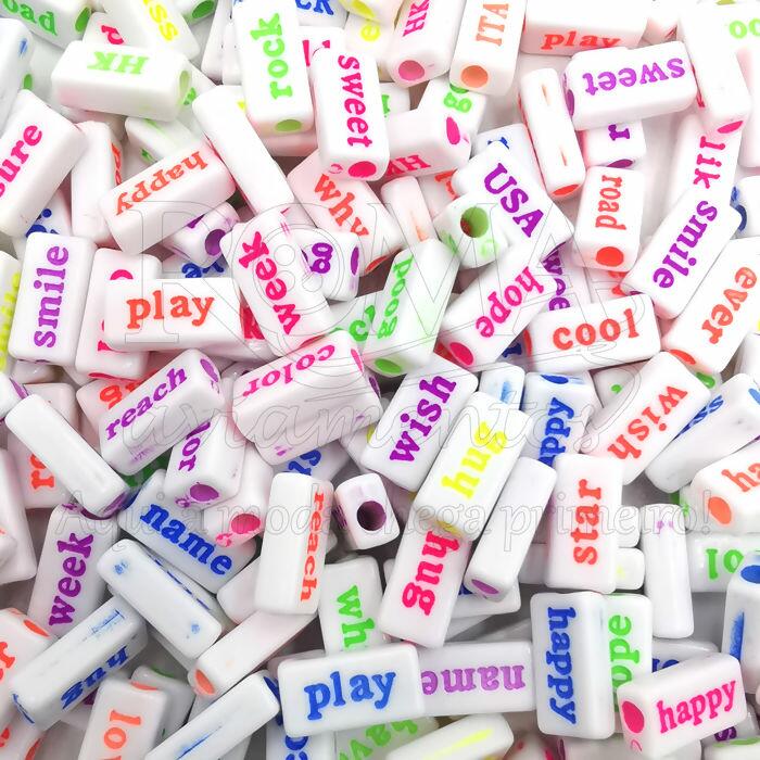 Descrição Miçanga Retangular com Palavras c/100 gr - 15mm x 7mm - RO.150633