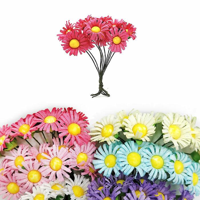São flores artesanais feitas em poliéster, que possuem arames para torção facilitando a decoração de objetos e ambientes. Essas flores podem ser usadas para coroas, tiaras, decoração de ambientes, potes, vasos artificiais e tudo que sua imaginação permitir.