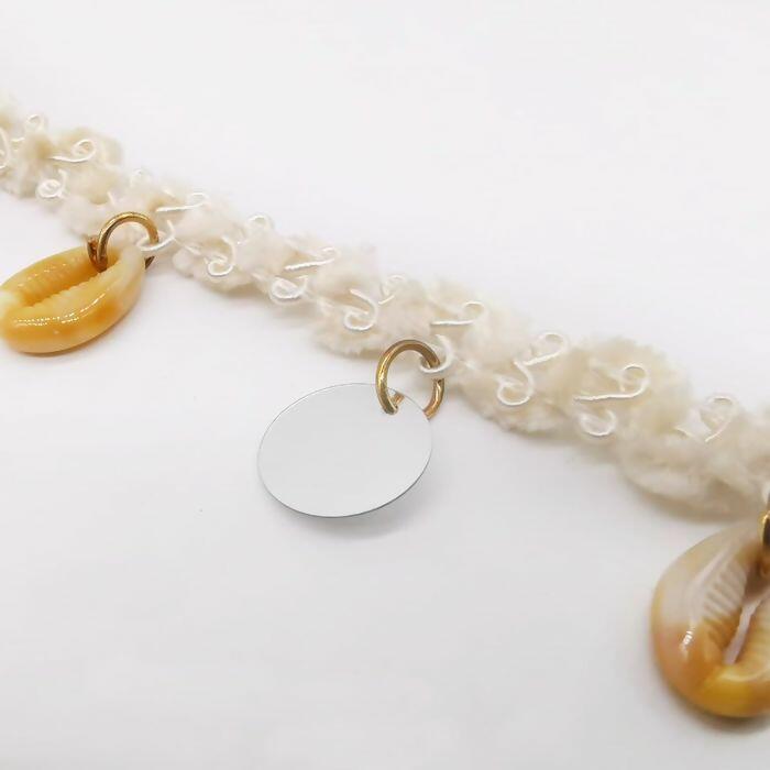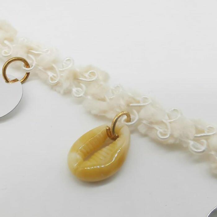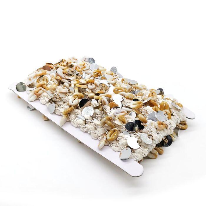 A passamanaria com búzios e paetês espelhados é um aviamento moderno e elegante que combina búzios em tom bege dourado com paetês redondos metálicos prateados, aplicados em uma renda delicada com argolas douradas. O contraste entre o rústico do búzio e o brilho dos paetês cria um visual sofisticado e versátil.