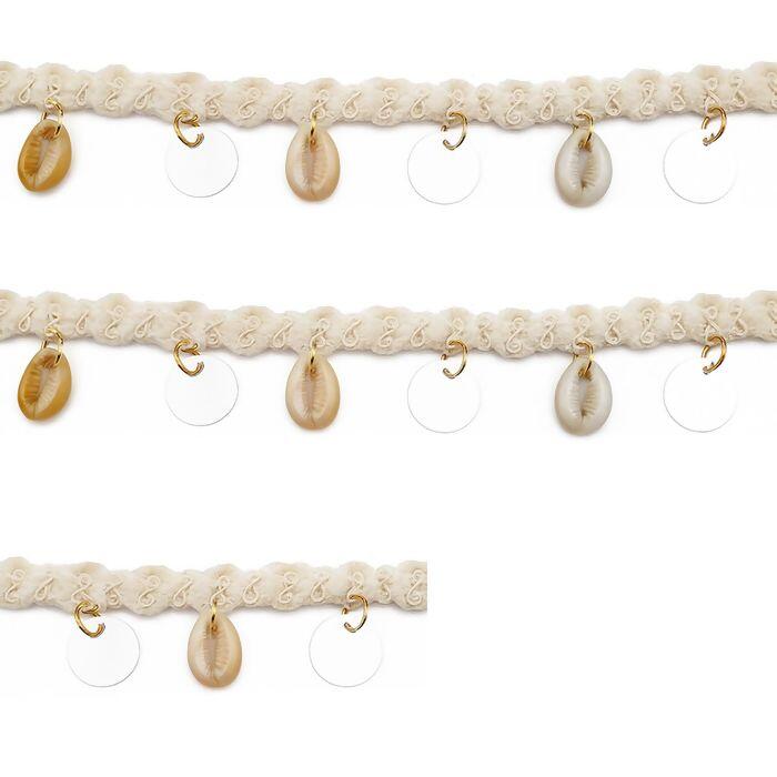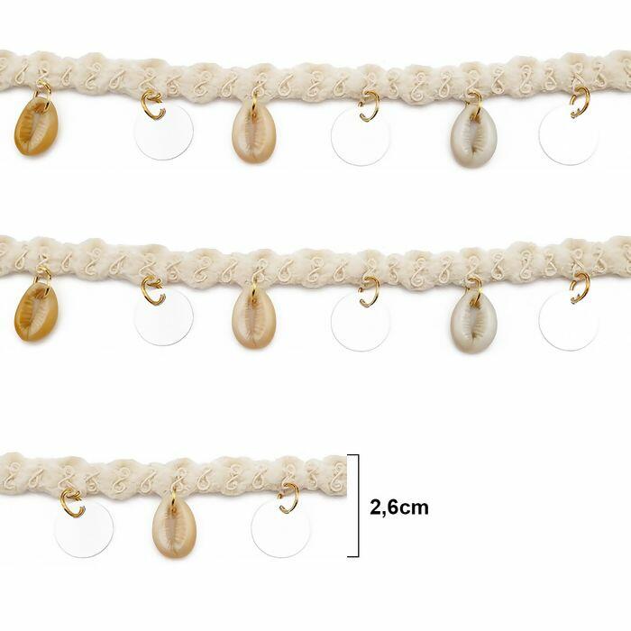 Descrição Passamanaria com Búzios e Paetês Espelhados 2,6cm x 13,7m Creme RO.154274