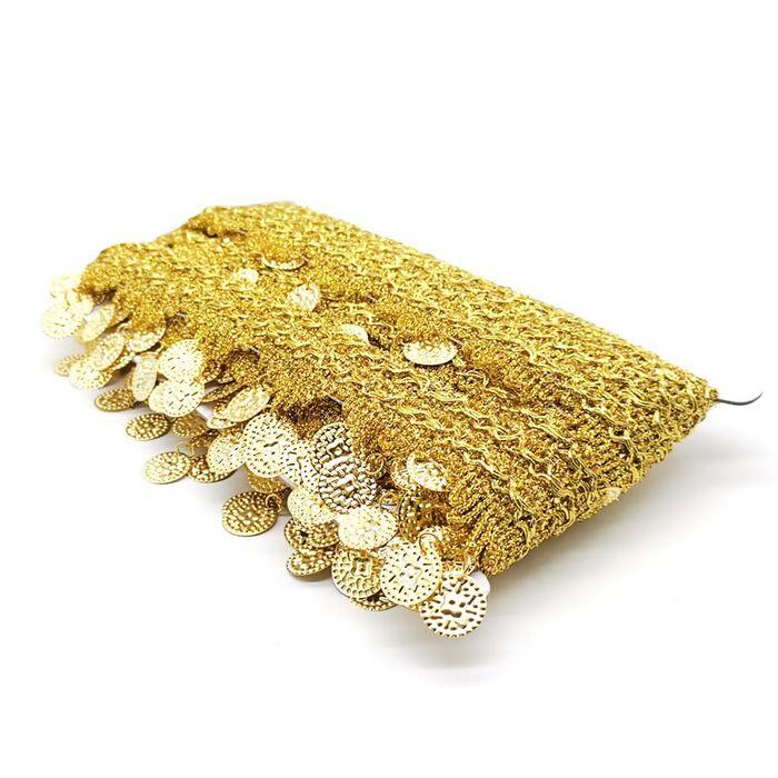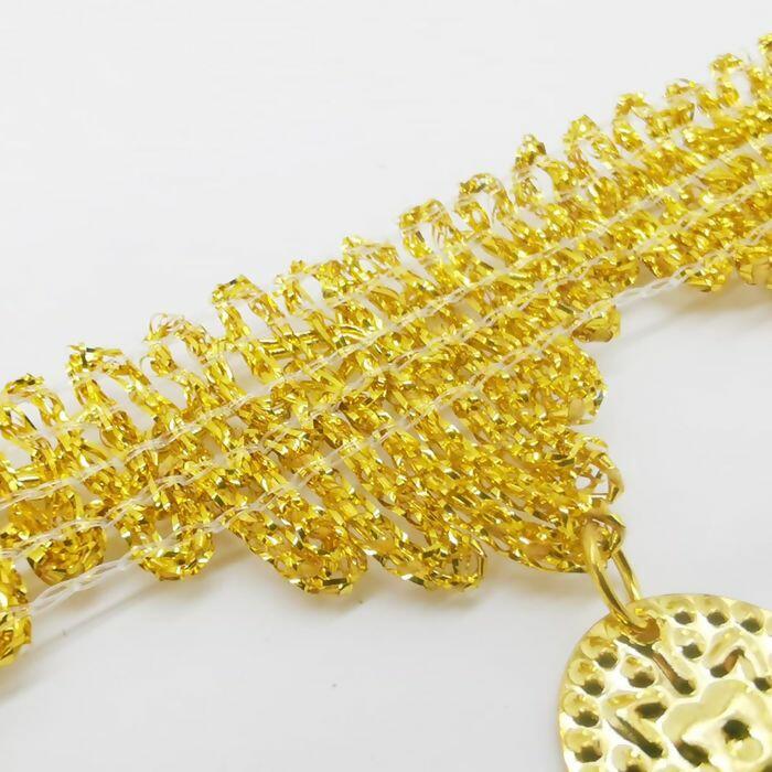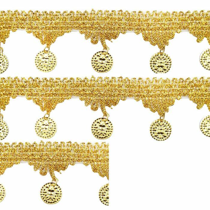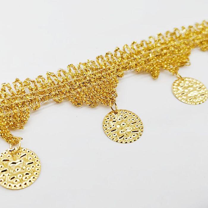 A passamanaria com moeda metalizada é um aviamento decorativo sofisticado, ideal para agregar charme e brilho em diferentes criações. Com acabamento dourado e detalhes em moedas penduradas, proporciona movimento e efeito luxuoso em peças de moda, acessórios e decoração.