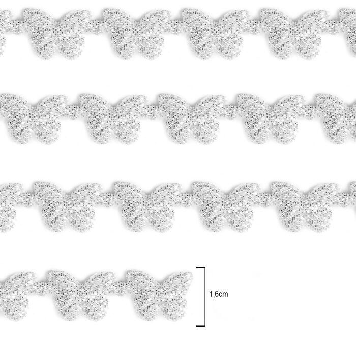 Descrição Passamanaria Marilda - 1,6cm x 5m - Mod.408 - Borboleta Lame Prata