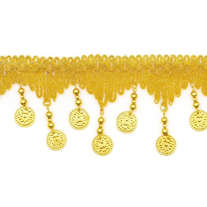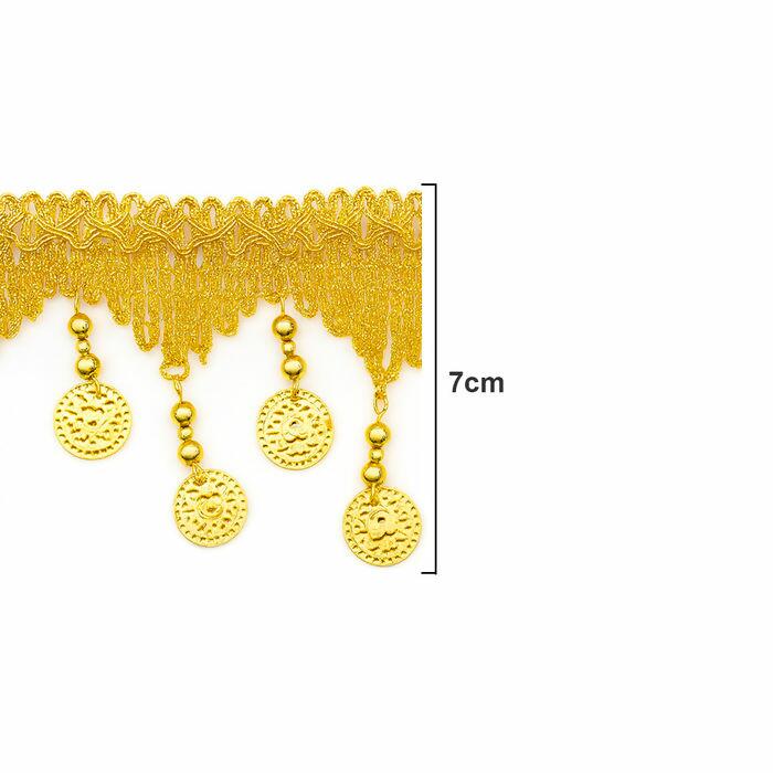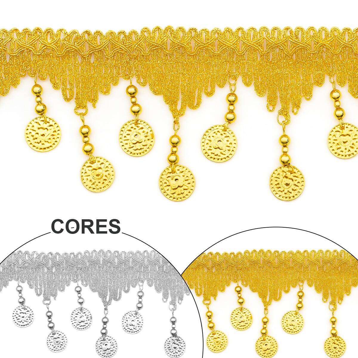 A passamanaria metalizada de 7cm é perfeita para quem busca um acabamento luxuoso, brilhante e cheio de movimento. Seu design com franjas decorativas e pingentes metálicos dá um toque sofisticado a peças de moda, decoração e artesanato profissional.