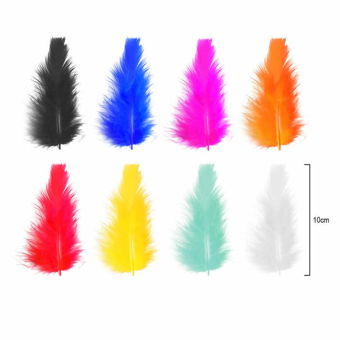 Penas coloridas de poliéster é ideal para confecção de enfeites de fantasias e roupas, bijuterias, uso escolar e muito mais.