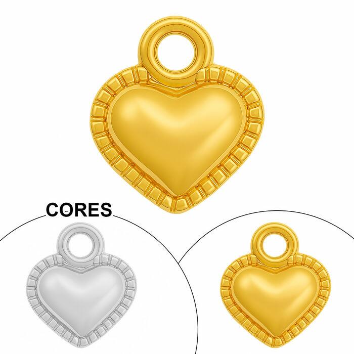 O pingente coração 12x14mm é o detalhe perfeito para deixar suas criações ainda mais delicadas. Feito em 100% plástico, possui acabamento com alto brilho e bordas texturizadas que imitam o metal, trazendo elegância e leveza às peças. Disponível nas cores dourado e niquelado, é resistente e fácil de aplicar.