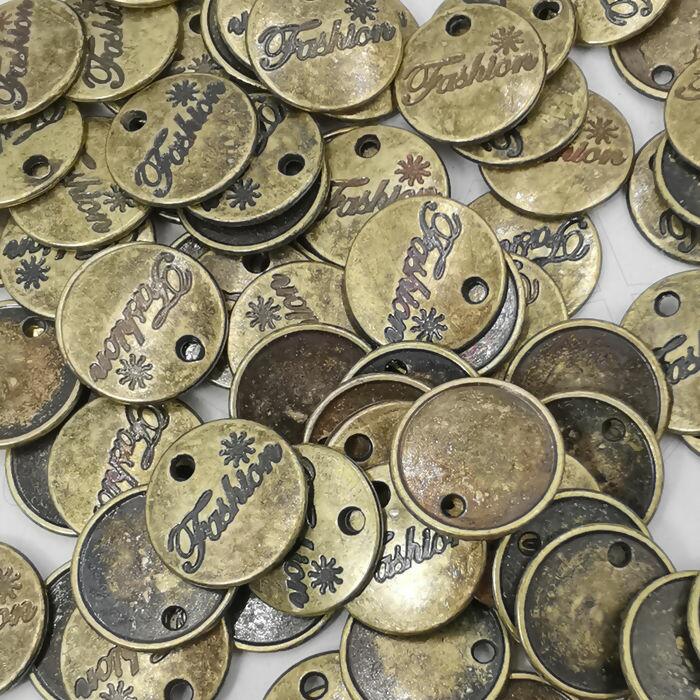 Descrição Plaquinha de Metal - 100 unidades - 13mm - Ouro Velho - Redonda Fashion