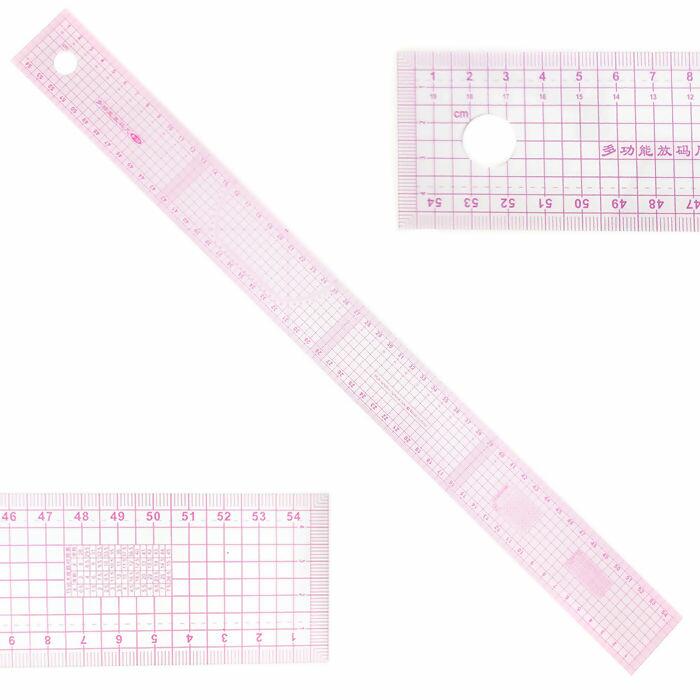Régua super versátil para quem faz trabalhos com cortes, modelagem e costura. Possui marcações em linhas vermelhas, de centímetros e polegadas. Super flexível.