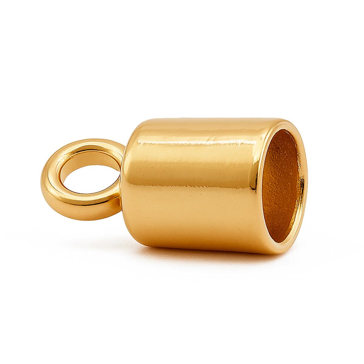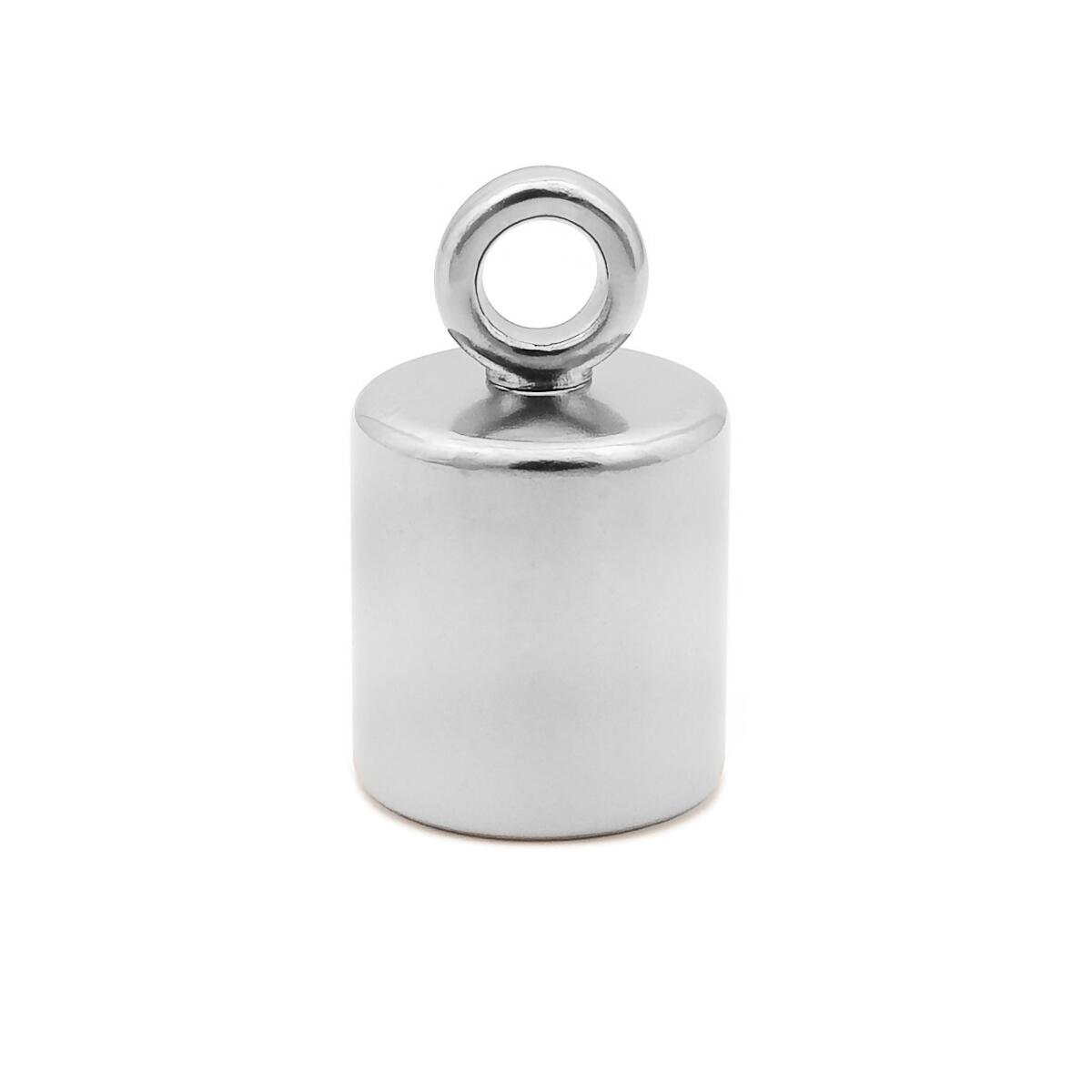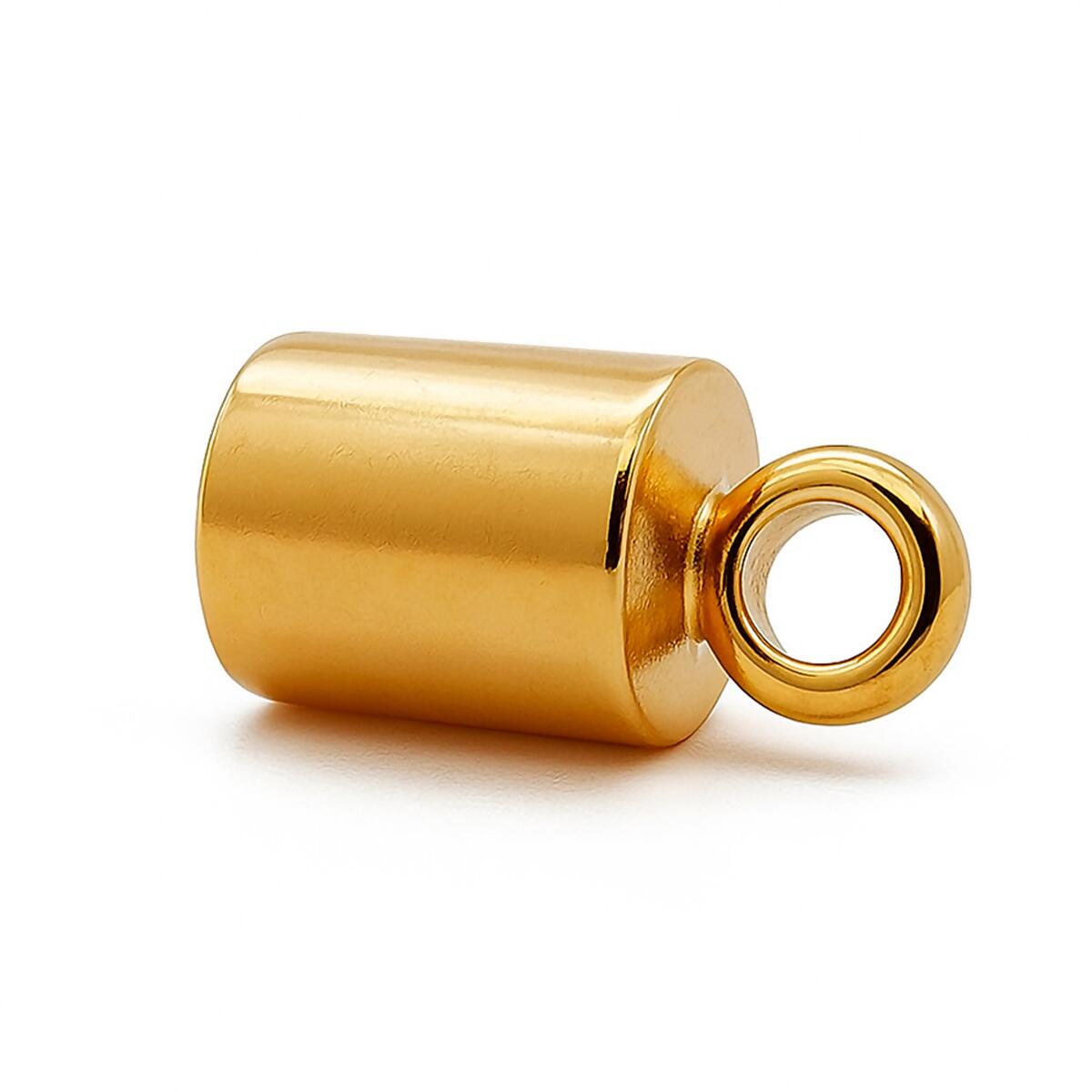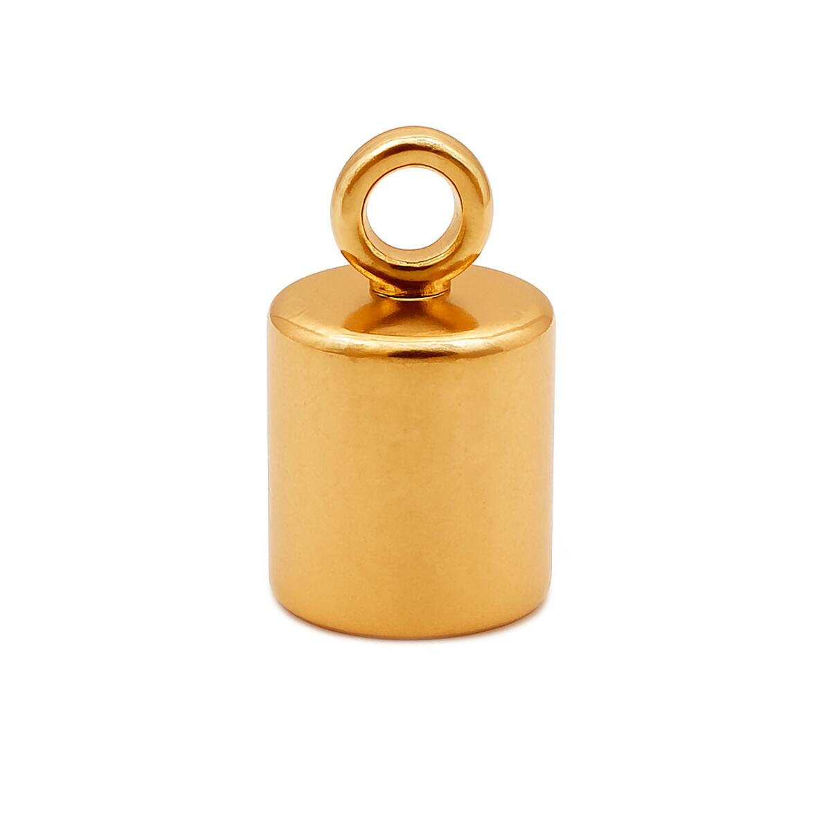 Formato cilíndrico reto com argola fixa para conexão de fechos ou correntes.
