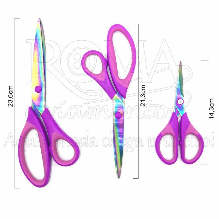Aqui na Roma Aviamentos você encontra kit com 3 tesouras de titanio, são 3 tesouras ideias para diversos tipos de trabalhos como, costura, escritório, papel, multiuso doméstica, hobby, tesouras de bolso, escolar e bordar.
