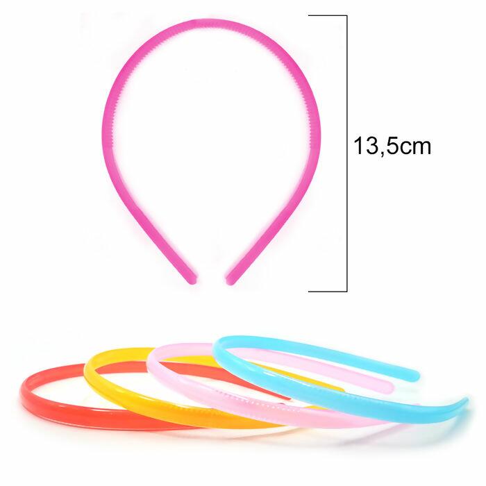 Tiara lisa de plástico com dentinhos para fixação, não machuca e possui um ótimo acabamento. Cores vivas com certeza é a tiara ideal para decoração podendo ser encapada e decorada com laços, fitas, apliques e ou pedrarias.