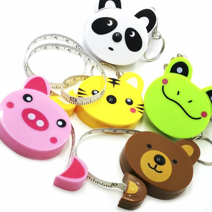 Fita métrica retrátil, com cinco opções muito fofas de chaveiro: porco, panda, tigre, sapinho e ursinho.